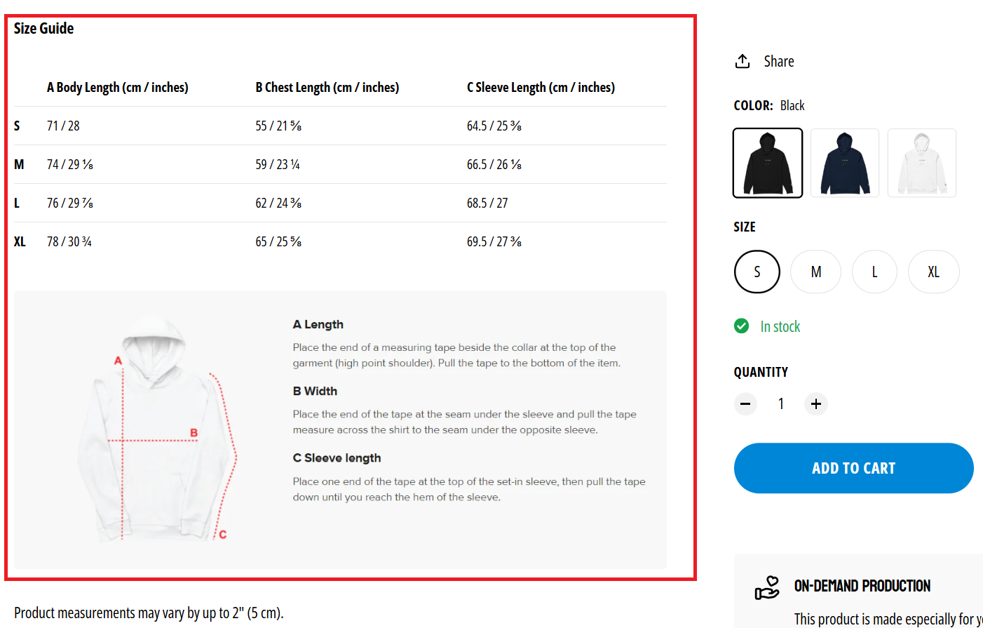 Tip: The detailed size guide is located on the product page under the “Description” section. The image below shows exactly where to locate it - here displayed on a hoodie product page as an example.